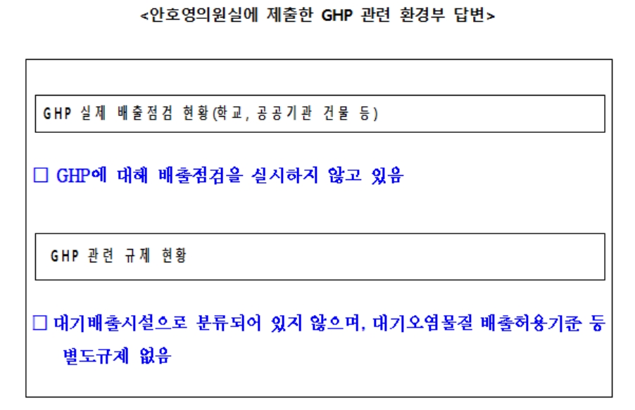 안 의원은 "자동차는 배출저감장치를 부착하고도 2년마다 검사를 실시하는데 정작 자동차와 유사한 엔진을 쓰는 GHP는 아무런 규제가 없다는 것은 어불성설"이라고 비판했다.