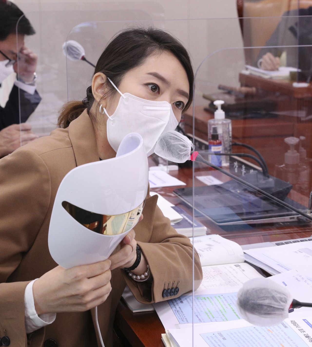 고민정 더불어민주당 의원이 7일 오전 서울 여의도 국회 산업통상자원중소벤처기업위원회 전체회의실에서 열린 산업통상자원부 국정감사에서 성윤모 산업부 장관에게 LED 마스크에 대해 질의하는 모습.(이미지 출처=연합뉴스)