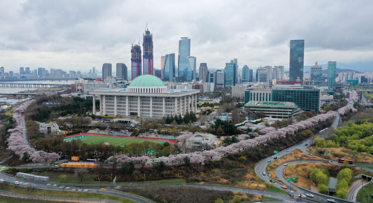 봄비가 내린 10일 서울 여의도 국회의사당 인근 윤중로에 벚꽃이 만개해 있다. /문호남 기자 munonam@