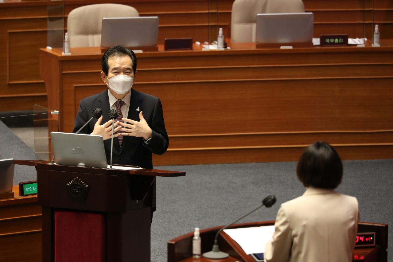 정세균 국무총리가 국회의 경제 분야 대정부질문에서 혜영 정의당 의원의 질의에 답변하는 모습.(이미지 출처=연합뉴스)