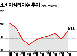 [아시아경제 김은별 기자] 신종 코로나바이러스감염증(코로나19) 재확산 여파에 하락했던 소비심리가 10월에는 다시 반등했다. 반등 폭은 금융위기 직후였던 2009년 4월 이후 가장 커 소비심리 반등에 대한 기대감을 키우고 있다.