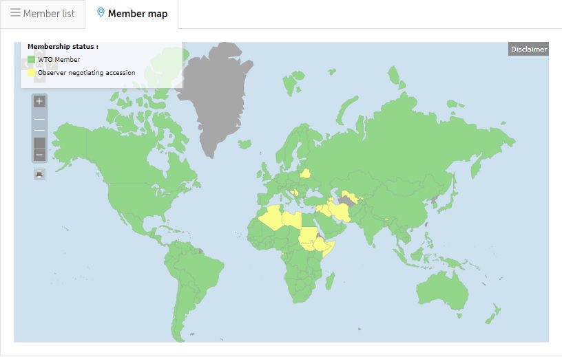 초록색이 WTO 가입국이다.(사진=세계무역기구 홈페이지 캡처)