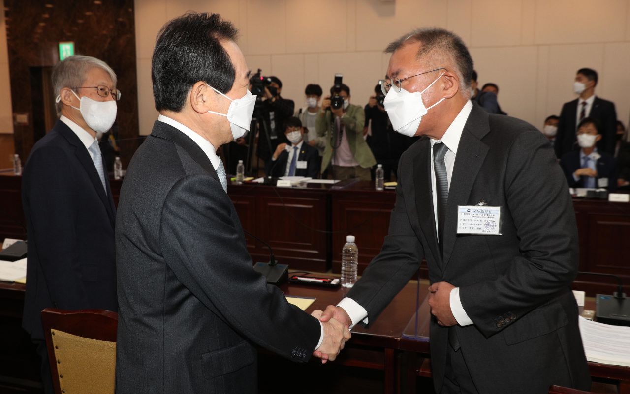 정세균 국무총리와 정의선 현대자동차그룹 회장이 지난 15일 서울 종로구 정부서울청사에서 열린 '제2차 수소경제위원회'에 참석해 악수하는 모습./강진형 기자aymsdream@