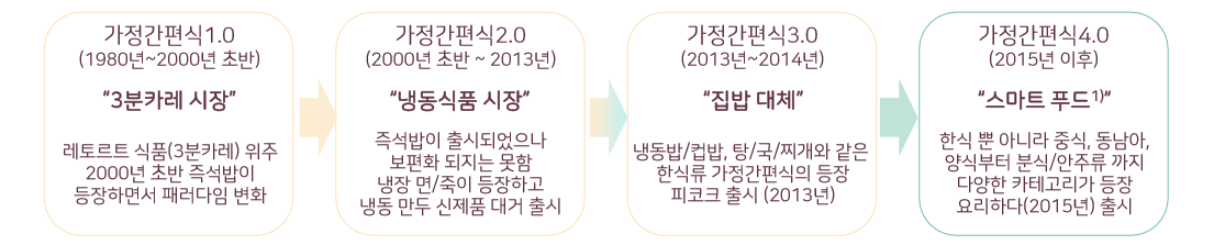 'HMR 3세대'(2013년~2014년)때부터 집밥을 대체하기 시작했다. 냉동밥ㆍ컵밥ㆍ탕ㆍ국ㆍ찌개 등 한식 HMR이 대폭 늘어났다. 이 역시 시장을 이끈 것은 CJ제일제당과 오뚜기 등 국내 대표 식품업체들이다. 이마트 등 유통업체까지 가세해 시장 참여업체들이 늘어난 것도 특징이다. 건강ㆍ맛ㆍ편리성ㆍ영양 등을 모두 고려한 제품이 나오면서 'HMR 4세대'(2015년 이후)가 열렸다. 제품 종류도 동네 편의점에서 흔히 찾아볼 수 있는 도시락부터 연어ㆍ스테이크ㆍ랍스터 등을 활용한 별미까지 다양해졌다. 유명 셰프의 요리법을 담은 '밀키트(반조리식)'나 태국ㆍ베트남ㆍ스페인 등 해외 요리를 적용한 간편식도 늘고 있다.