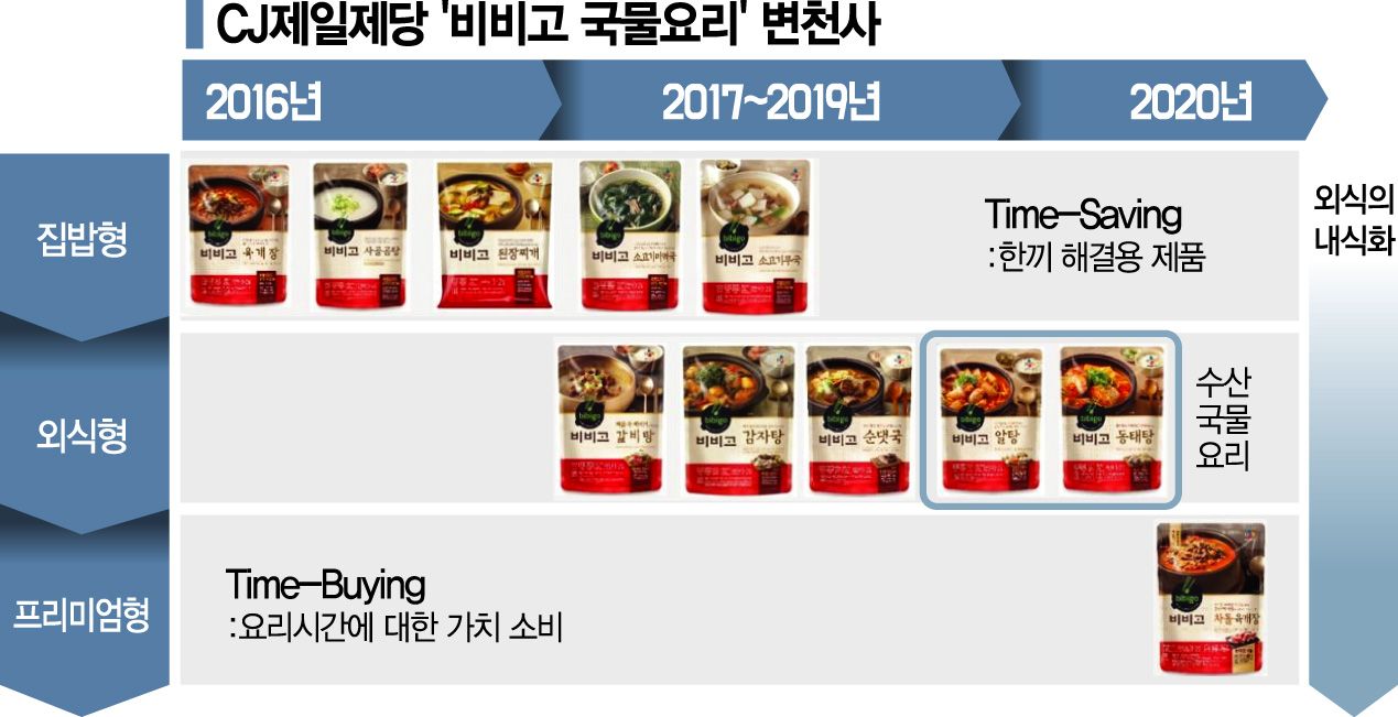 레스토랑 메뉴 그대로, HMR 5세대로 진화식품업계는 시장 성장세에 발맞춰 HMR 진화를 지속적으로 꾀하고 있다. 'HMR 1세대'(1980년대~2000년대 초반)는 레토르트 식품 위주로 편의성을 가장 강조한 제품을 꼽는다. 오뚜기의 3분 카레가 대표적이다. 이후 냉동식품 위주의 냉동만두ㆍ냉장면ㆍ죽의 등장으로 'HMR 2세대'(2000년 초반~2013년) 시대가 열렸다. CJ제일제당과 풀무원, 아워홈 등은 냉동 만두 신제품을 대거 선보이며 시장을 이끌었다.