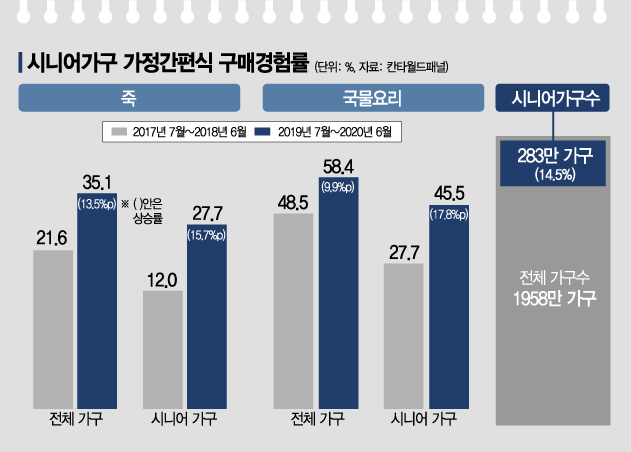 "여보, 곰국 대신 간편식 사놨어요"30일 칸타월드패널에 따르면 가구 내 최저연령 55세 이상 기준 시니어 가구(283만 가구, 전체 1958만 가구의 14.5% 차지)의 간편식 상품죽 구매경험률은 2019년 7월부터 2020년 6월까지 전전년 동기 대비(2017년 7월부터 2018년 6월까지) 15.7%p 증가했다. 전체 가구 구매 경험률이 13.5%p 증가한 것보다 증가율이 높다. 특히 국물요리를 많이 찾는다. 전체 가구 국물요리 경험률은 9.9%p 증가한 반면 시니어 가구의 구매 경험률 증가율은 17.8%p에 달했다.