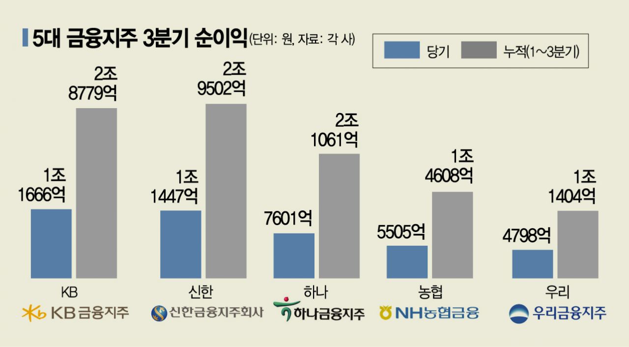 ◆KBㆍ신한 1조원대…5대지주 일제히 선방 = 30일 금융권에 따르면 KB금융과 신한금융은 3분기에 각각 1조1666억원과 1조1447억원의 순익을 기록해 분기 순익 1조원대 시대를 열었다. KB금융은 3분기 순익이 전년 동기 대비 24.1%, 신한금융은 16.6% 증가했다. 전분기에 견주면 각각 18.8%, 31.1% 늘어난 결과다. 하나금융은 3분기 7601억원의 순익을 달성했다. 전년 동기에 대비 9.15% 뒷걸음했으나 전분기보다는 10.3% 올라섰다. 우리금융 또한 전년 동기에 견주면 1.13% 낮아진 4798억원의 순익을 기록했는데, 전분기와 비교하면 2배가 넘는 238% 뛰어올랐다. NH농협금융은 3분기 5505억원의 순익을 기록했다. 전년 동기 대비 38.8% 증가했고 전분기보다는 3.7% 줄었다.