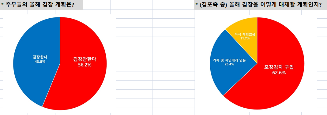 매년 김장을 포기하는 ‘김포족’은 늘고 있다. 그 이유로는 ‘고된 노동과 스트레스가 걱정돼서(31.2%)’가 가장 많았고, ‘긴 장마로 배추 등 채소값이 비싸서(28.1%)’, ‘적은 식구 수로 김장이 불필요해서(16.4%)’ 등이 뒤를 이었다.