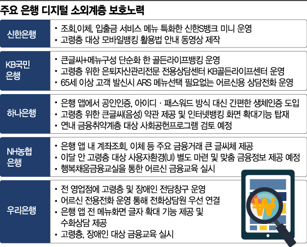 금융당국은 은행권에 디지털금융 소외계층 보호에 힘써 줄 것을 특별히 당부하고 있는 상황. 윤석헌 금융감독원장은 지난달 26일 시중은행장들과 만난 자리에서 "디지털화, 비대면거래 확산 등으로 오프라인 영업점이 축소되는 분위기 속에 고령층 등 디지털 소외계층의 불편이 초래되지 않도록 노력해달라"고 당부했다. 금융위원회는 은행권에 점포 축소에 따른 고령층의 불편을 최소화하기 위한 대체창구를 마련하고 고령층 전용 은행 앱 개발 등 대책을 마련하라고 주문했다.