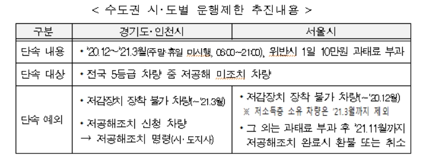먼저 노후 경유차 등 배출가스 5등급 차량 중 배출가스저감장치(DPF)를 부착하지 않은 차량에 대해 수도권에서의 운행을 제한한다.