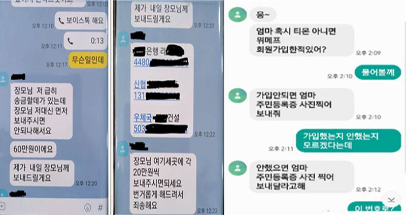 [아시아경제 김효진 기자] "장모님, 저 급히 송금할 데가 있는데 먼저 보내주시면 안될까요. 60만원이에요" "엄마 혹시 티O이나 위OO 회원 가입한 적 있어? 가입 안되면 엄마 주민등록증 사진 찍어서 보내줘"