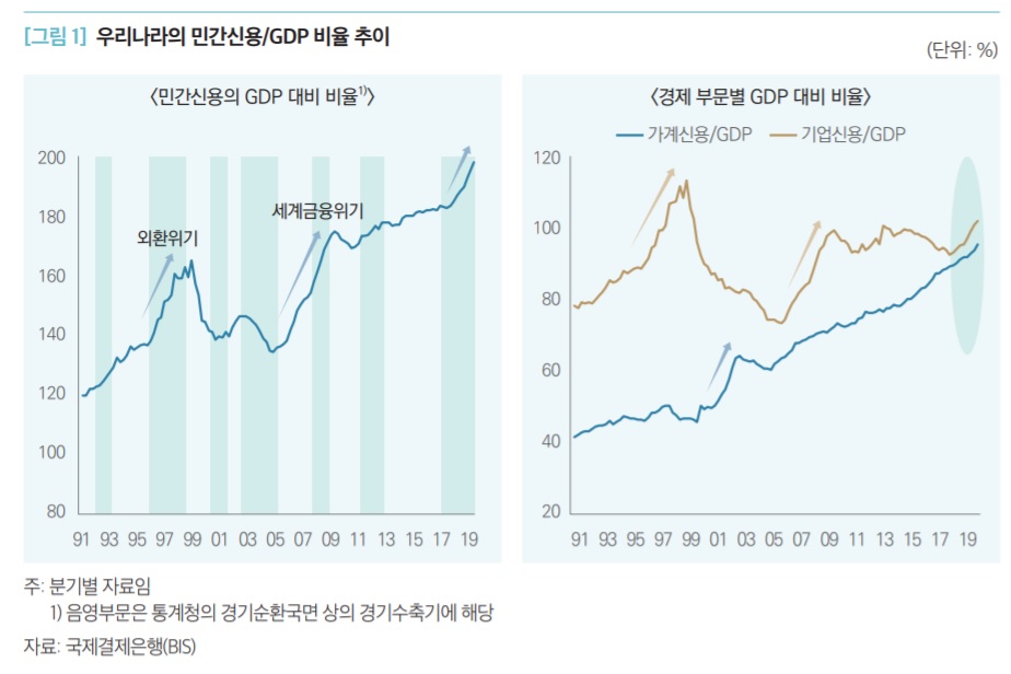 최근 우리나라의 GDP대비 민간신용 비율은 지난 1998년 외환위기, 2008년 금융위기 전후 증가세 이후 가장 가파른 양상을 보이고 있다. 국제결제은행(BIS) 등에 따르면 한국의 GDP대비 민간신용 비율은 금융위기 이후 완만한 증가세를 보이다가 2018년 4분기부터 지난해 말까지 8분기만에 15.5%포인트나 급증했다. 지난해 말 비율도 197.6%로 직전해(187.6%) 대비 10%포인트 증가했다.