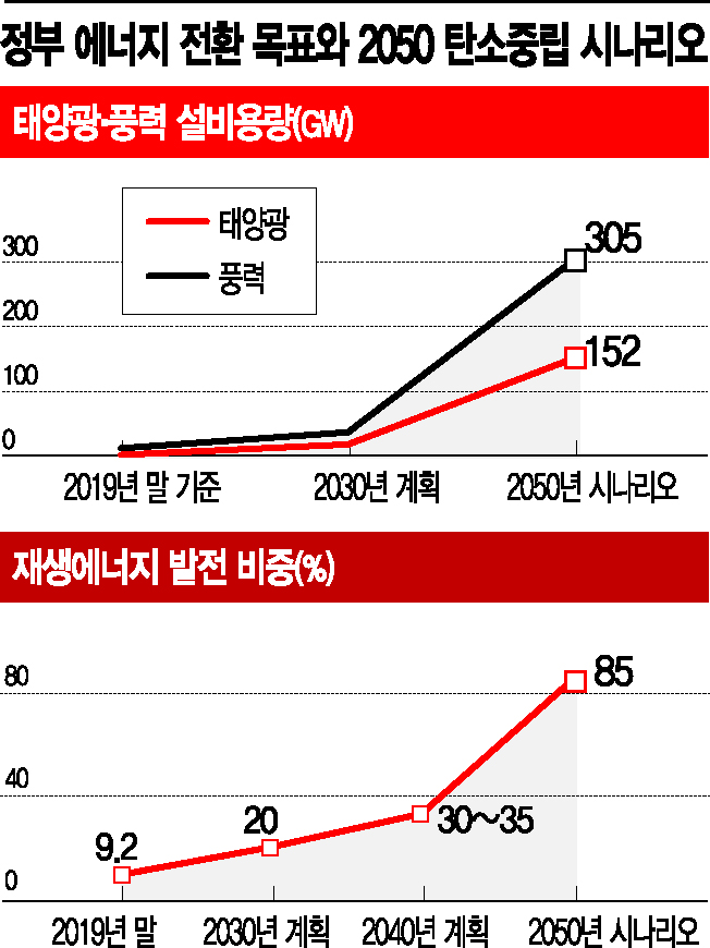 2050년 탄소중립을 실현하려면 태양광과 풍력 설비용량을 각각 305GW, 152GW까지 총 457GW 구축해야 한다는 연구결과(한국환경정책ㆍ평가연구원, KEI)도 있다. 지난해 말 기준 태양광ㆍ풍력 설비용량은 13.2GW에 불과하다. 태양광ㆍ풍력 설비를 지금보다 35배 늘려야 한다는 얘기다. KEI가 제시한 '탄소중립 시나리오'에 따르면 2050년까지 재생에너지 비중은 85%로 높이고 석탄발전 비중은 단계적으로 낮춰 0% 수준에 도달해야 한다. 이창훈 KEI 선임연구위원은 "정부 계획대로라면 2050년 재생에너지 발전 비중이 50% 수준밖에 안 되기 때문에 탄소중립을 달성에는 턱없이 부족하다"며 "2030년 이후에 가속도를 내는 방법이 있고, 지금부터 조금씩 속도를 내는 방안도 있을 것"이라고 밝혔다.
