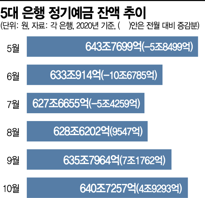 [아시아경제 조강욱 기자] 지난달 주요 시중은행의 정기예금이 5조원 가량 급증한 것으로 나타났다. 예금 이자율이 0%대까지 떨어진 초저금리 속에서도 8월과 9월에 이어 3개월 연속 증가세를 보이고 있다. 신종 코로나바이러스감염증(코로나19) 사태의 장기화로 경기 불확실성에 대한 우려가 커진 가운데 공모주 거품 논란마저 커지면서 안전자산 선호 심리가 확대됐기 때문으로 풀이된다.