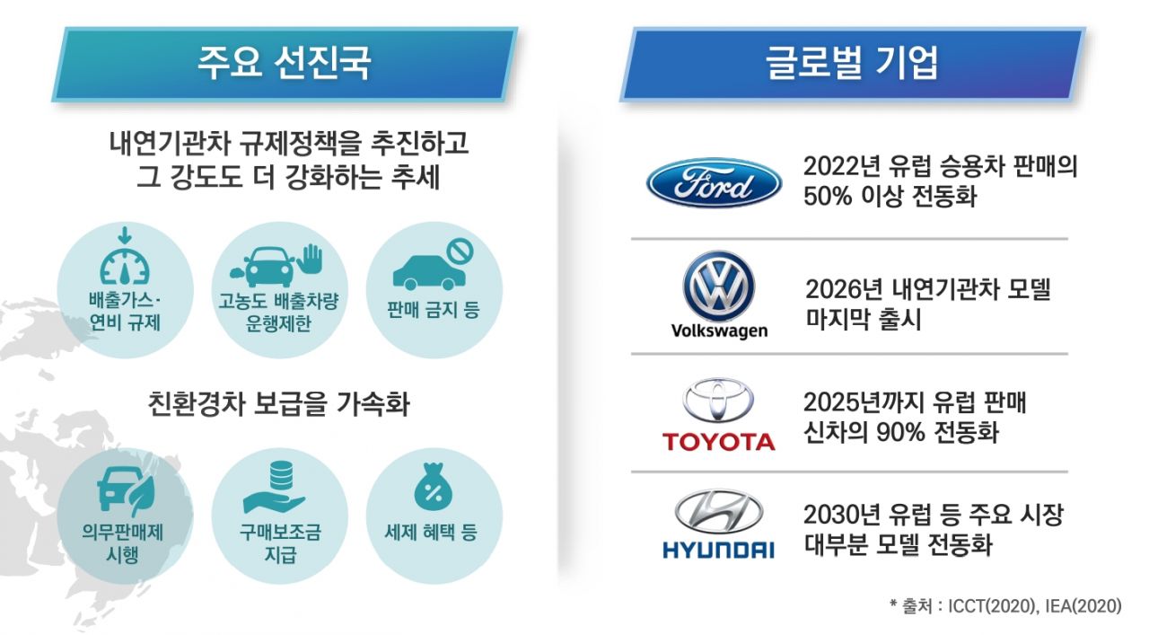 국가기후환경회의는 친환경차 전환 로드맵 마련도 추진한다. 다시 말해 내연기관차 퇴출 시기를 정하는 것이다. 휘발유, 경유차 등 내연기관차는 미세먼지와 온실가스의 주요 배출원임에도 여전히 국내 차량의 대부분을 차지하고 있다고 봤다. 경유값 인상이 수요 억제책이라면, 내연기관차 판매 제한은 공급 억제책이다.