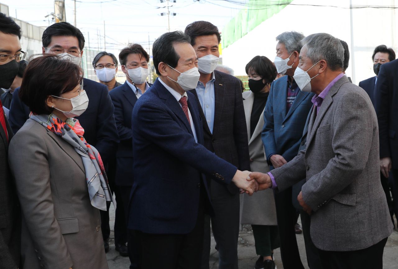 정세균 국무총리가 7일 경북 포항시를 방문, 지진피해 주민과 인사하는 모습.(이미지 출처=연합뉴스)