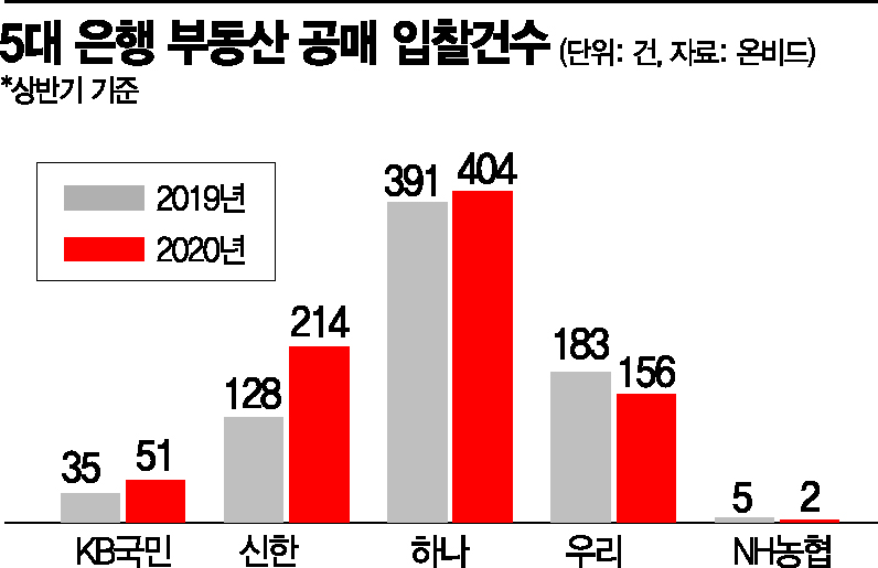 15일 한국자산관리공사(캠코)의 공매 시스템인 온비드에 따르면 5대 시중은행(KB국민ㆍ신한ㆍ우리ㆍ하나ㆍNH농협은행)의 올해 상반기 부동산 공매 낙찰 건수는 48건으로 총 804억원에 달한다. 같은 기간 은행들이 입찰을 진행한 부동산 공매 건수는 827건이다. 전년 동기(742건)보다 85건 늘었다.