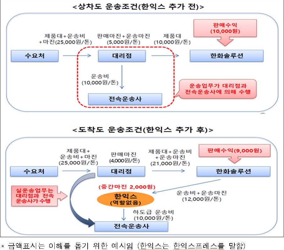 더 심각한 문제는 한화솔루션이 한익스프레스가 통행세를 수취할 수 있도록 도와준 정황이 포착됐다고 공정위가 판단을 내렸다는 점이다. 공정위는 "한화솔루션이 대리점을 통해 수요처와 거래할 때 운송 거래 과정에서 실질적인 역할을 하지 않은 한익스프레스를 거래단계에 추가해 통행세를 받을 수 있도록 지원했다"고 설명했다.