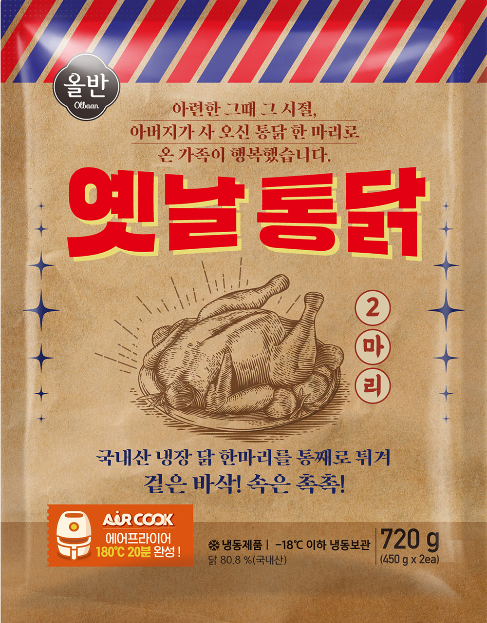 9일 신세계푸드는 에어프라이어 전용 간편식 ‘올반 옛날통닭’을 출시했다고 밝혔다. 이 제품은 1970~1980년대 시절 부모님이 퇴근길에 사오시던 재래시장 통닭의 맛과 추억을 그대로 되살릴 수 있도록 고안된 제품이다. 제품 패키지도 통닭을 감싸던 노란 종이 봉투의 느낌이 나도록 디자인해 복고 감성을 고스란히 느낄 수 있도록 했다. 180도로 예열한 에어프라이어에서 20분간 조리하면 갓 튀겨낸 듯한 바삭한 통닭을 맛볼 수 있어 간편하다.