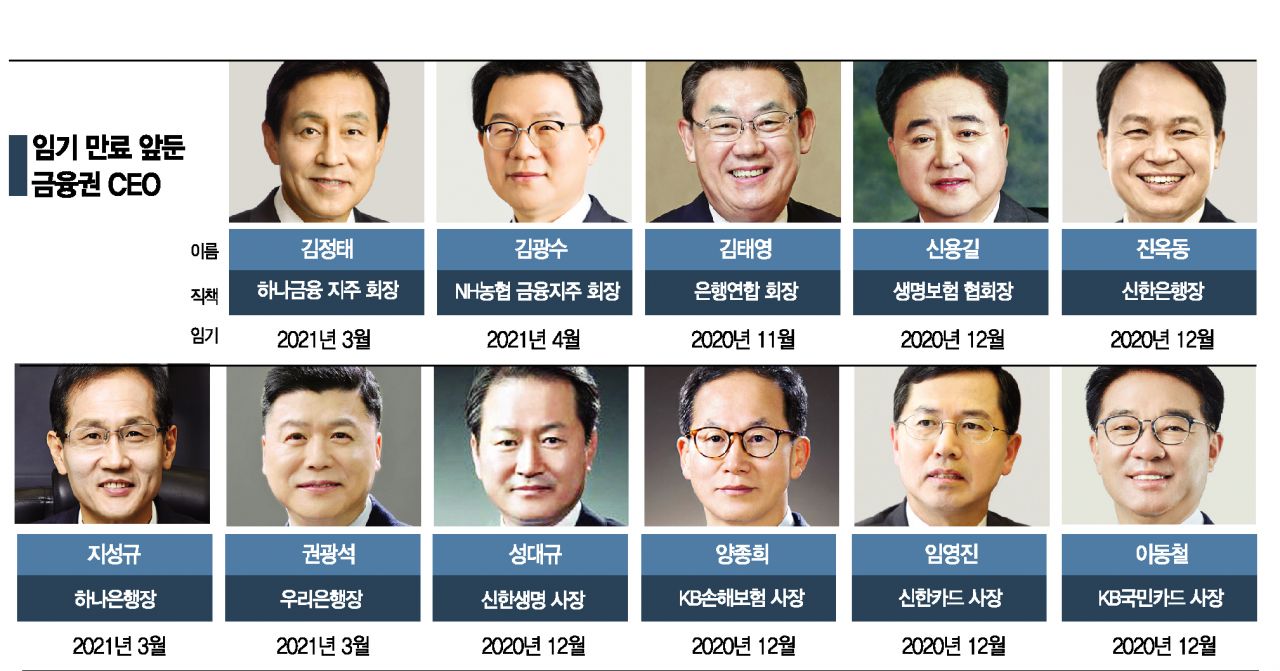 금융권 관계자는 "임기 연장 및 교체 가능성 등에 대해 섣불리 예단할 수는 없지만 주요 계열사 CEO 인사와 맞물려 금융권에서 큰 폭의 자리 이동 가능성이 예상된다"면서 "현재처럼 코로나19와 같은 특수 상황에서라면 결국 실적과 위기관리 여부가 연임과 교체의 희비를 엇갈리게 할 것"이라고 진단했다.