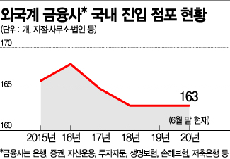 은행 뿐 아니라 증권, 자산운용, 투자자문, 생명ㆍ손해보험, 저축은행 등의 상황도 마찬가지다. 외국계 금융회사의 국내 점포 수는 2016년 168개에서 2017년과 2018년 각각 165개, 163개로 줄어들었다. 이후 올해 6월 말 현재 163개로 제자리걸음 중이다.