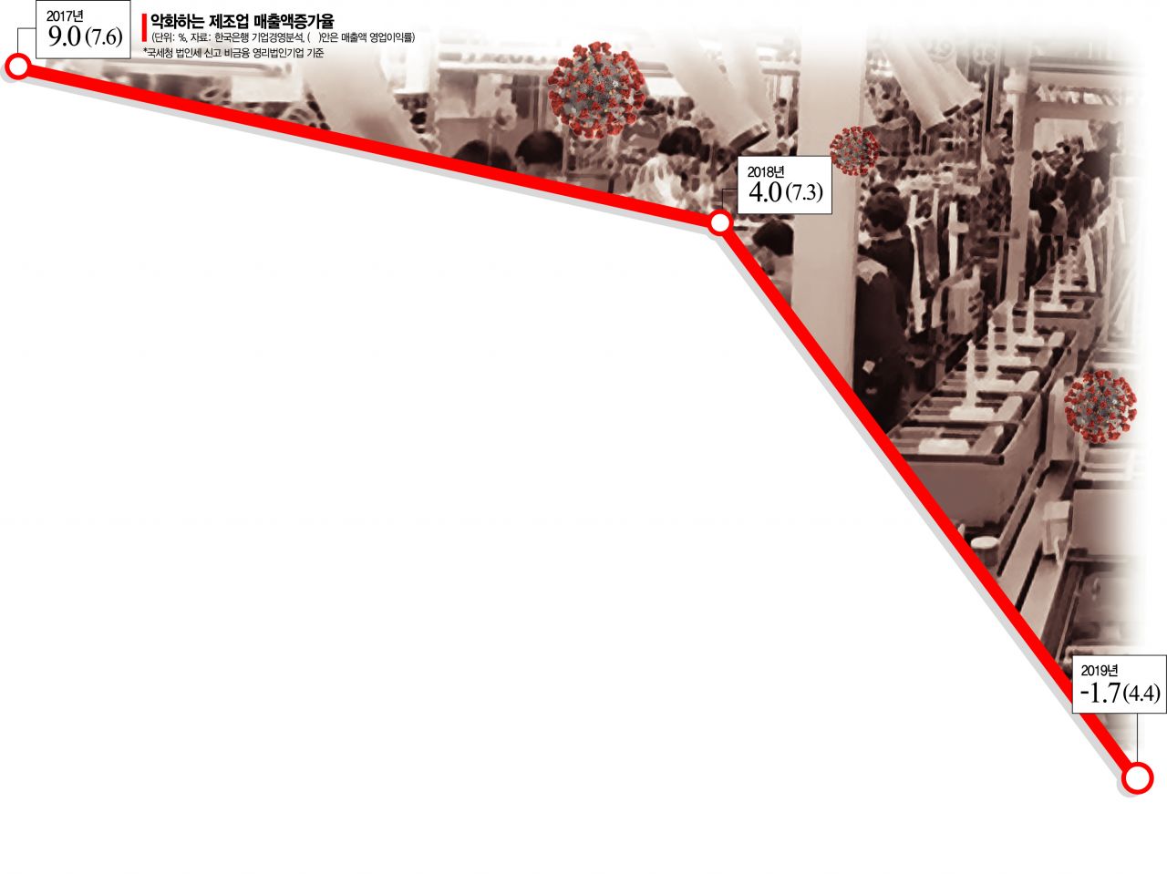 10일 한국은행 기업경영분석에 따르면 이번 정부 들어 제조업의 성장성ㆍ수익성은 일제히 악화했다. 2017년 9.0% 수준이던 제조업 매출액증가율은 2018년 4.0%, 지난해 -1.7%까지 떨어졌다. 제조업의 수익성을 나타내는 지표인 매출액영업이익률도 2017년 7.6%에서 2018년 7.3%, 2019년 4.4%까지 하락했다. 코로나19 충격에 올해 제조업 관련 지표는 더 악화했을 것으로 예상된다. 우리나라 제조업의 매출액영업이익률은 2009년 이후 꾸준히 5% 수준을 유지해왔다. 2014~2016년 매출액증가율이 마이너스를 나타낼 때에도 영업이익률은 버텼다. 매출이 감소해도 비용을 줄여 수익성을 유지할 수 있었던 셈이다. 그러나 최근 기업들의 자구책만으로는 급감하는 매출을 감당하기 어려운 상황이 됐다는 분석이 가능하다.